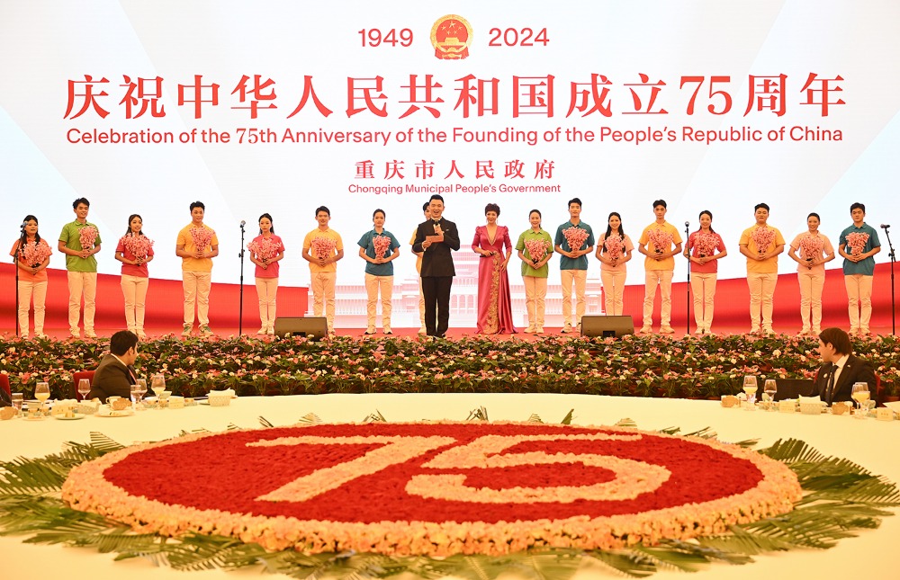 渝州宾馆锦绣厅花团锦簇、灯光璀璨,10面五星红旗分列主席台两侧,烘托出喜庆的节日气氛。主席台正中,“庆祝中华人民共和国成立75周年”红色大字鲜艳夺目。