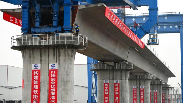 △2024年3月1日,成渝中线高铁首孔箱梁架设完成。(图/视觉中国)