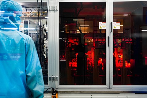 视角从产品端,转向生产端。长虹新能源公司生产线上,生产材料在高速生产线上自动上线加工,一旁的新能源集控中心,大屏幕上的数字不断跳动,生产计划、实时产线情况、设备生产效率等数据一目了然。