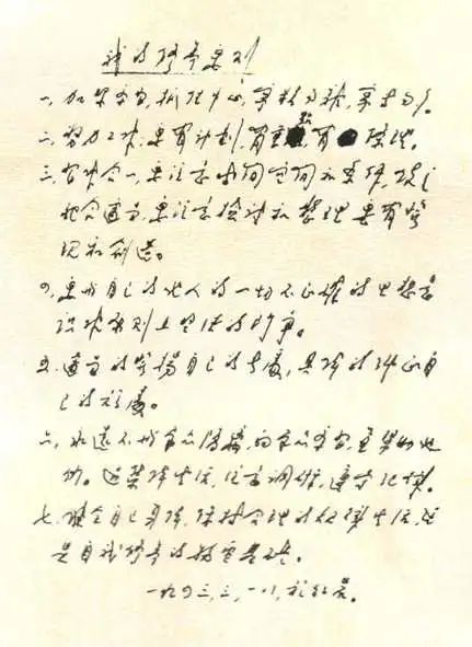 六、永远不与群众隔离,向群众学习,帮助他们。过集体生活,注意调研,遵守纪律。