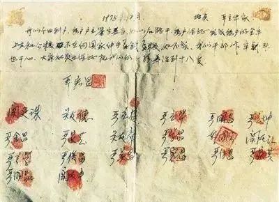 凤阳县小岗村18位农民按下红手印的“大包干”契约
