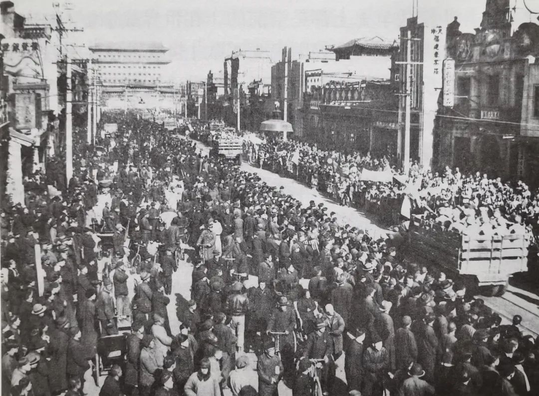 北平和平解放后,人民解放军部队举行盛大的入城式