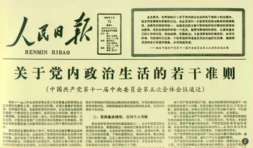 1980年2月,党的十一届五中全会通过《关于党内政治生活的若干准则》,并向全社会公布。《准则》总结了历史上党内政治生活的经验教训,把党章的有关规定和民主集中制的原则具体化,提出12个方面的要求:坚持党的政治路线和思想路线;坚持集体领导,反对个人专断;维护党的集中统一,严格遵守党的纪律;坚持党性,根绝派性;要讲真话,言行一致;发扬党内民主,正确对待不同意见;保障党员的权利不受侵犯;选举要充分体现选举人的意志;同错误倾向和坏人坏事作斗争;正确对待犯错误的同志;接受党和群众的监督,不准搞特权;努力学习,做到又红又专。