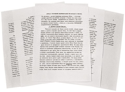 《四川省重庆共产主义组织的报告》(俄译稿)。1956 年,苏共中央向中共中央交还了包括中共一大档案在内的一批珍贵档案,其中包括这份《四川省重庆共产主义组织的报告》。(重庆史研究会 供)