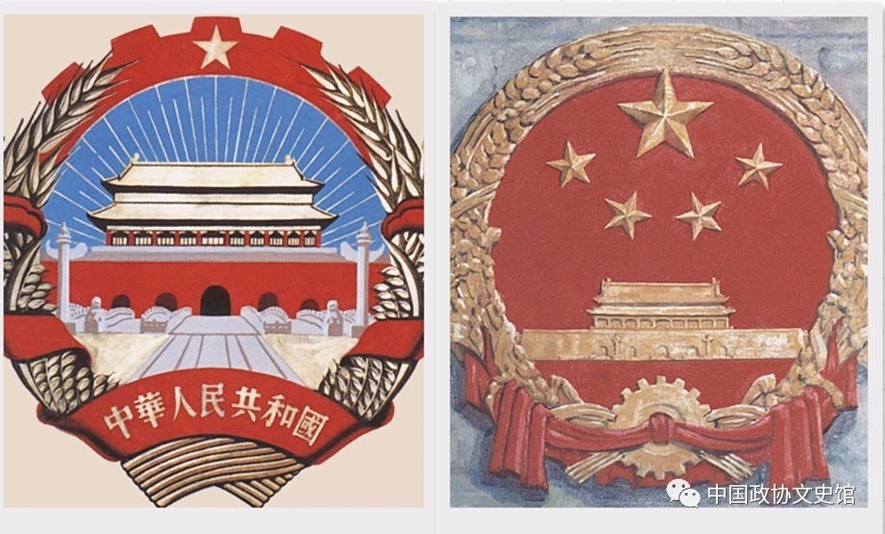 他们经常在中南海的待月轩共同讨论和修改图案,广泛吸收党内外各界人士的意见,参考国内外有关资料,拟出了几幅基本的草图。以张仃等人为主的中央美术学院的设计方案以天安门为主体,以梁思成等人为主的清华大学的设计方案则以“璧”为主体并以绶带连接齿轮和麦穗。以上图案送政协全国委员会常务委员会审定,经常委会讨论研究,认为“均未恰当”。
