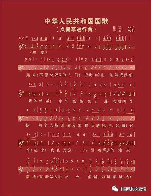 第一,关于国歌。虽然应征稿中有关国歌的词谱较多,但大家感到并不满意,认为在短时间内创作出理想的国歌词谱是困难的。在最后几次的讨论会上,先后由刘良模、梁思成、张奚若等提议,以《义勇军进行曲》作为国歌,在应征来稿中,也有人提此建议。《义勇军进行曲》由田汉作词,聂耳作曲,是电影《风云儿女》的主题曲,不仅是鼓舞中国人民争取民族独立的号角,而且有着长期的历史,大多数人都会唱。有人认为歌词中“中华民族到了最危险的时候”应修改,但大多数人持相反观点,这样就引起对歌词是否需要修改的争论。后来这个问题报告了筹委会常委会,由大会主席团研究决定。