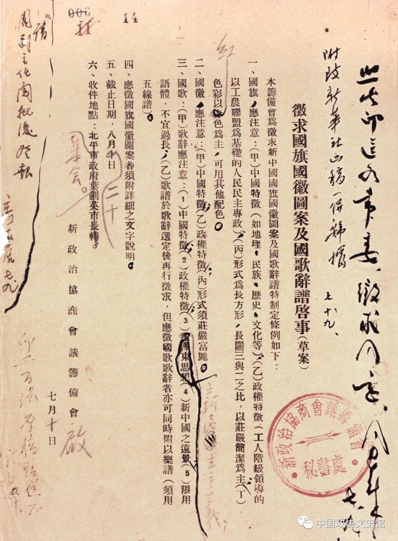 ▲《征求国旗、国徽图案及国歌辞(词)谱启事(草案)》
