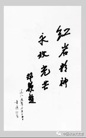 在休息室里,红岩纪念馆的同志准备了纸笔请邓大姐题词,她挥笔写下“红岩精神,永放光芒”八个大字,下面落款“邓颖超一九八五年十月十四日重返红岩”。这“重返”二字显出了大姐对红岩感情之深。