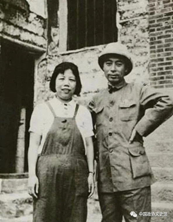 ▲1939年5月,日机轰炸后,邓颖超和周恩来在重庆红岩八路军办事处门前留影。