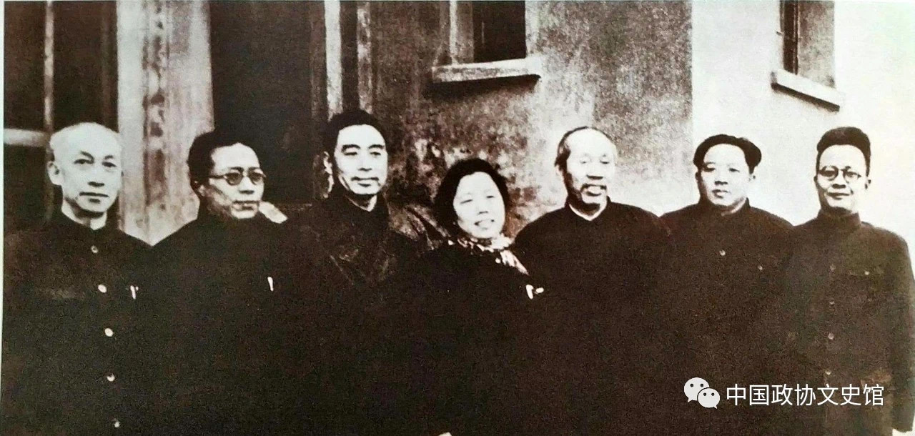 ▲1946年1月,在重庆出席政治协商会议的中共代表团成员合影。左起:吴玉章、陆定一、周恩来、邓颖超、董必武、王若飞、秦邦宪。