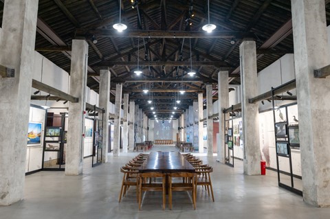 广阳岛上现存机场遗址共28处,其中碉堡8个、士兵营房8栋、美军招待所2个、油库6个、防空洞2个、发电房1个,通往广阳岛的钢筋混凝土桥梁1座。广阳营曾是广阳坝机场的营房。我们所在的位置正是1号营房,这是整个广阳坝机场抗战遗址群中最大的两座营房之一,为原址保护修缮建筑。歇山式小青瓦屋顶,砖柱承重,夯土墙分割开间,木质门窗,环建筑主体四周设置贯通式外廊。整体看去,方正严谨、朴实厚重。往里走,墙壁上张贴着营房的历史照片,历史的斑驳烙印在古旧的建筑上,单薄的砖柱横亘在屋顶和地面之间,显得萧瑟冷寂。