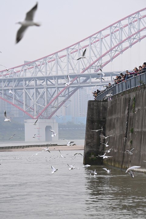 “以前从来没看过这么多候鸟飞到重庆主城,前几天听说朝天门可以看‘海鸥’,所以来看看。”11月7日下午1点多,62岁的谢明趁着难得的艳阳天,邀家人专程从沙坪坝乘车来到了南滨路。此时的南滨路沿江步道上,观鸟的市民已是络绎不绝。一些市民买来面包想吸引红嘴鸥啄食,好与之来个亲密接触;一些摄影爱好者则架起“长枪短炮”,欲记录下红嘴鸥翱翔江面的美好瞬间。“确实漂亮,希望以后年年都能看到这些红嘴鸥。”在亲眼目睹羽毛洁白的红嘴鸥时而翻飞觅食,时而巡游飞舞,时而成群结队围绕着江中游轮盘旋,谢明赞叹不已。