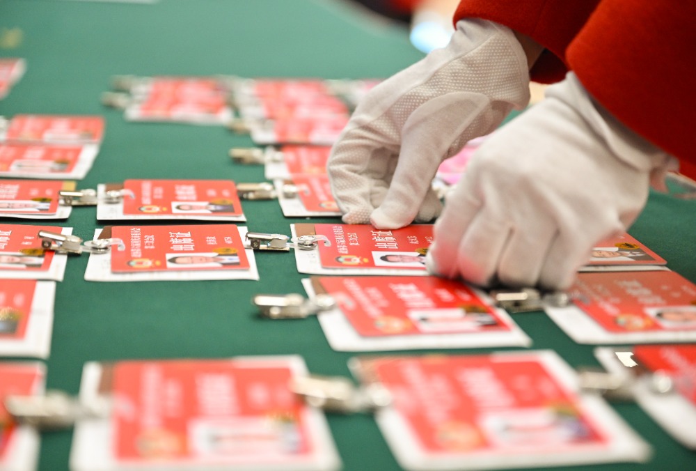 ▲2025年1月17日,政协委员住地,工作人员将出席证摆放整齐。记者 刘力 摄