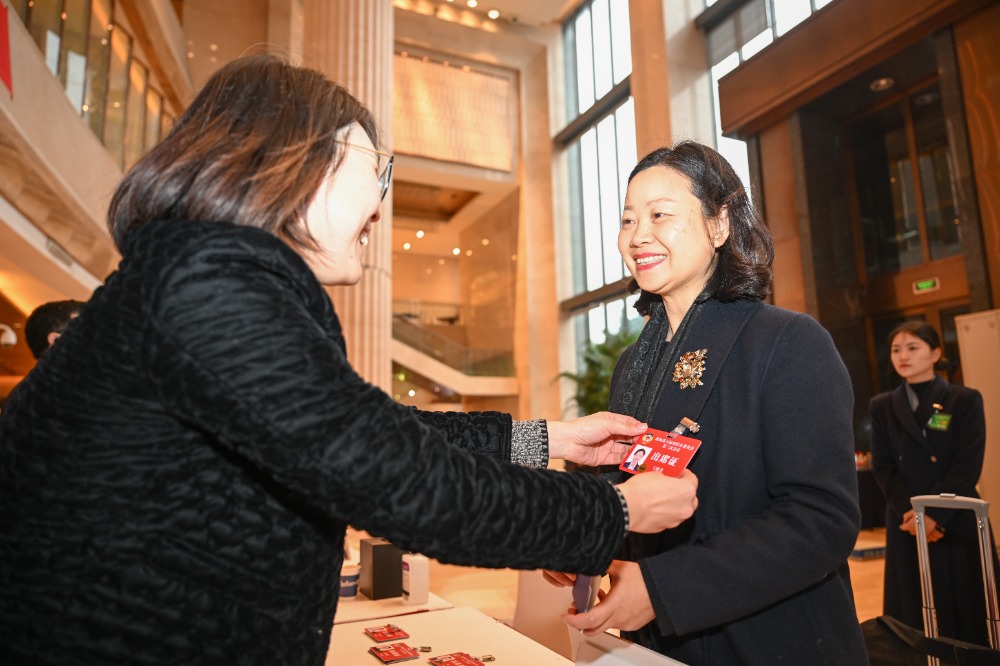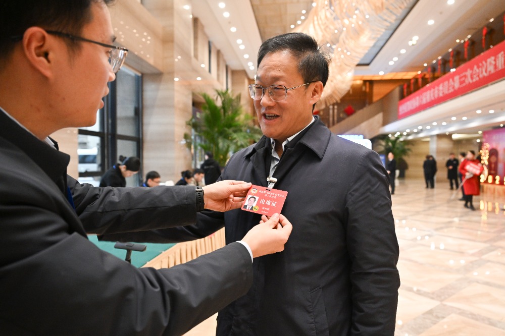 ▲2025年1月17日,政协委员住地,工作人员为出席会议的市政协委员佩戴证件。记者 谢智强 摄
