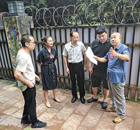 九龙坡区政协委员毛铁(右一)等现场调研该区金茂珑悦小区背后的爱心小路。(资料图)九龙坡区政协供图