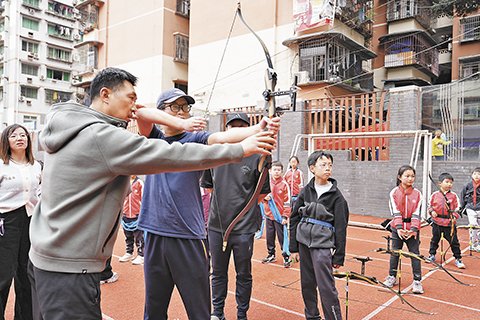 在大渡口区实验小学,台湾青年与学生一起体验射箭运动项目。记者 程卓 摄