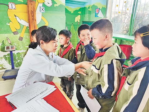 盟员冯叶维为碗厂小学学生进行健康体检。民盟重庆市委会供图